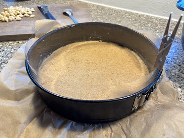 Kør 160 g digestive kiks og 80 g smuttede mandler igennem løghakkeren eller lignende så det bliver til smulder. Smelt 200 g smør og bland det sammen med kikse/mandel smulderet. Fordel masse jævnt i en springform, jeg har brugt en på 24 cm i diameter. Inden massen fordeles fores springformen med bagepapir i bunden og på siderne, alternativt anvendes lagkagefolie til indersiden af kanten. Tryk massen tæt og fast med en ske og stil det på køl i en time.