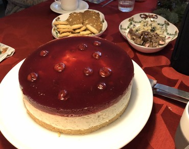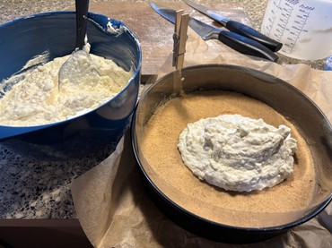 Kog risengrød af 90 g ris og ½ l sødmælk, tilsæt en knivspist salt. Den skal afkøles inden brug i cheesecake‘en. Hvis man som jeg er til Pamaris, svarer det til en halv portion.