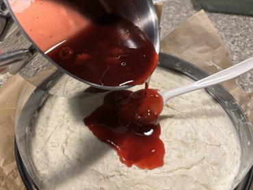 Læg 4 blade husblas i blød i kold vand, cirka 10 minutter. Varm kirsebærsaucen op til lige under kogepunktet. Tage gryden af varmen, vrid husblassen for vand og kom det i gryden. Nu skal det køle af til stuetemperatur. Er væsken for varme smelter den risalamandecremen. Når kirsebærsaucen har den rette temperatur, hældes den forsigtigt i springformen. Hæld på bagsiden af en ske eller lignende så fordeler det sig pænt uden at lave huller i cremen.